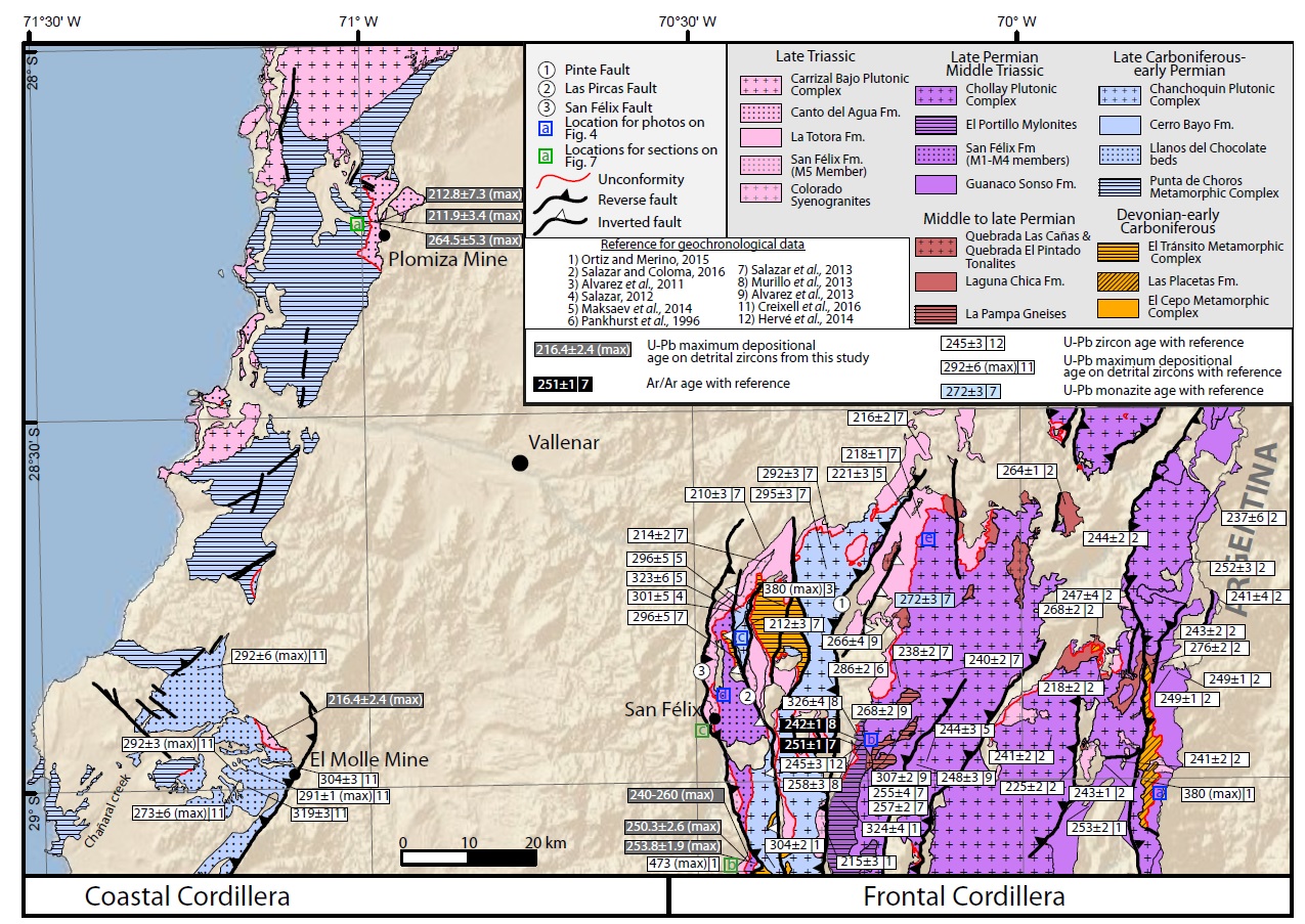 In northern Chile, between the 28° and 29° S, Permian to Lower Jurassic rocks crop out widely from the coastline to the Andean water divide (i.e., Chile-Argentina international border, Fig. 1). These rock units include clastic sedimentary successions, volcanic successions, and plutonic and metamorphic complexes (Reutter, 1974; Moscoso and Covacevich, 1982; Ribba et al., 1988; Mpodozis and Kay, 1992; Welkner et al., 2006; Murillo et al., 2013; Salazar et al., 2013; Salazar and Coloma, 2016; Figs. 2 and 3). Such wide variety of Permian-Triassic rocks offers a unique record for the surface and subsurface geological processes that took place in the Gondwanean margin during the end of the Gondwanides and the birth of the early Andean Orogenic Cycle.