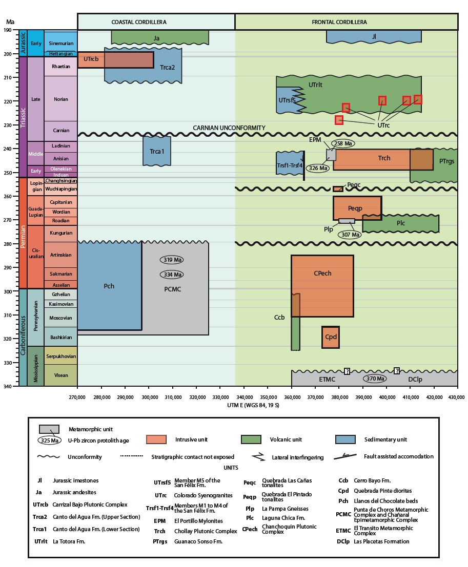 FIG. 3 Chronostratigraphic scheme of the Paleozoic and Triassic units from the Coastal and Frontal Cordilleras in the study area. Based on Cohen et al. (2013).