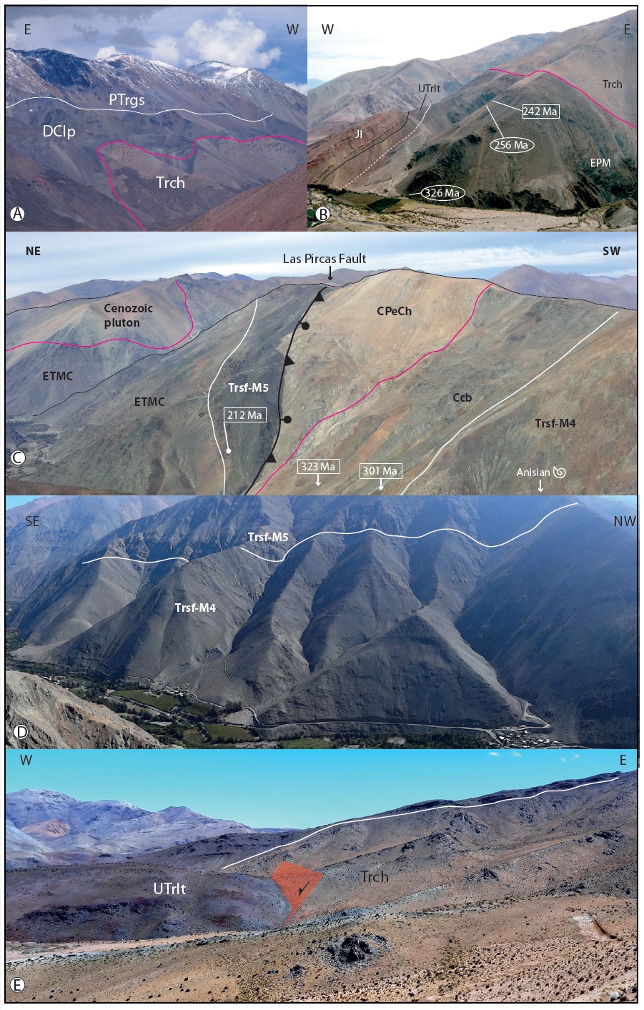 FIG. 4. Field photographs of main contact relationships mentioned in the text. Photographs are taken from areas shown in figure 2 and they are also indicated in the block diagrams of figure 8. Pink lines are intrusion contact and white lines are unconformities. Units abbreviation same as in figure 3. A. Valeriano river, highest peaks constitute the Chile-Argentina international border; B. Northeastern slope of the El Tránsito river, el Portillo locality. Ovals and square show protolith and deformation ages, respectively, obtained by Murillo et al. (2013); C. Southern slope of the El Tránsito river, near the conjunction with the Del Carmen river. Square show tuff U-Pb ages by Salazar et al. (2013); D. Del Carmen river, western slope. Unconformity between members M4 and M5 of the San Félix Formation; E. Eastern slope of the La Totora creek, red polygon represents a normal fault synchronous with the deposition of the La Totora Formation.