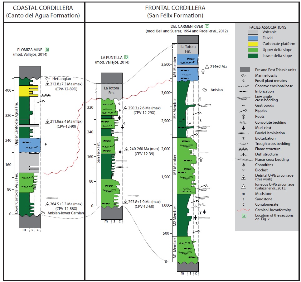 Sedimentological studies interpret the San Félix Formation (Triassic) as a marine fan delta depositional system, where conglomeratic members M1 and M5 correspond to delta plain fluvial system, fine grained M2 and M4 members correspond to prodelta environments and the sandy to conglomeratic M3 member as the upper part of the delta slope, with episodic subaerial exposure (Reutter, 1974; Ribba, 1985; Bell and Suárez, 1994; Padel et al., 2012; Salazar et al., 2013). Published geochronological data show a depositional gap between members M4 and M5 of at least 20 Ma (Zeil, 1958; Barthel, 1958; Ribba, 1985; Salazar et al., 2013; Fig. 3) which suggests that the topmost M5 member of the formation represents a fluvial system within a different geological context, likely influenced by the volcanic processes related to the La Totora Formation, since these two units laterally interfinger (Table 1).