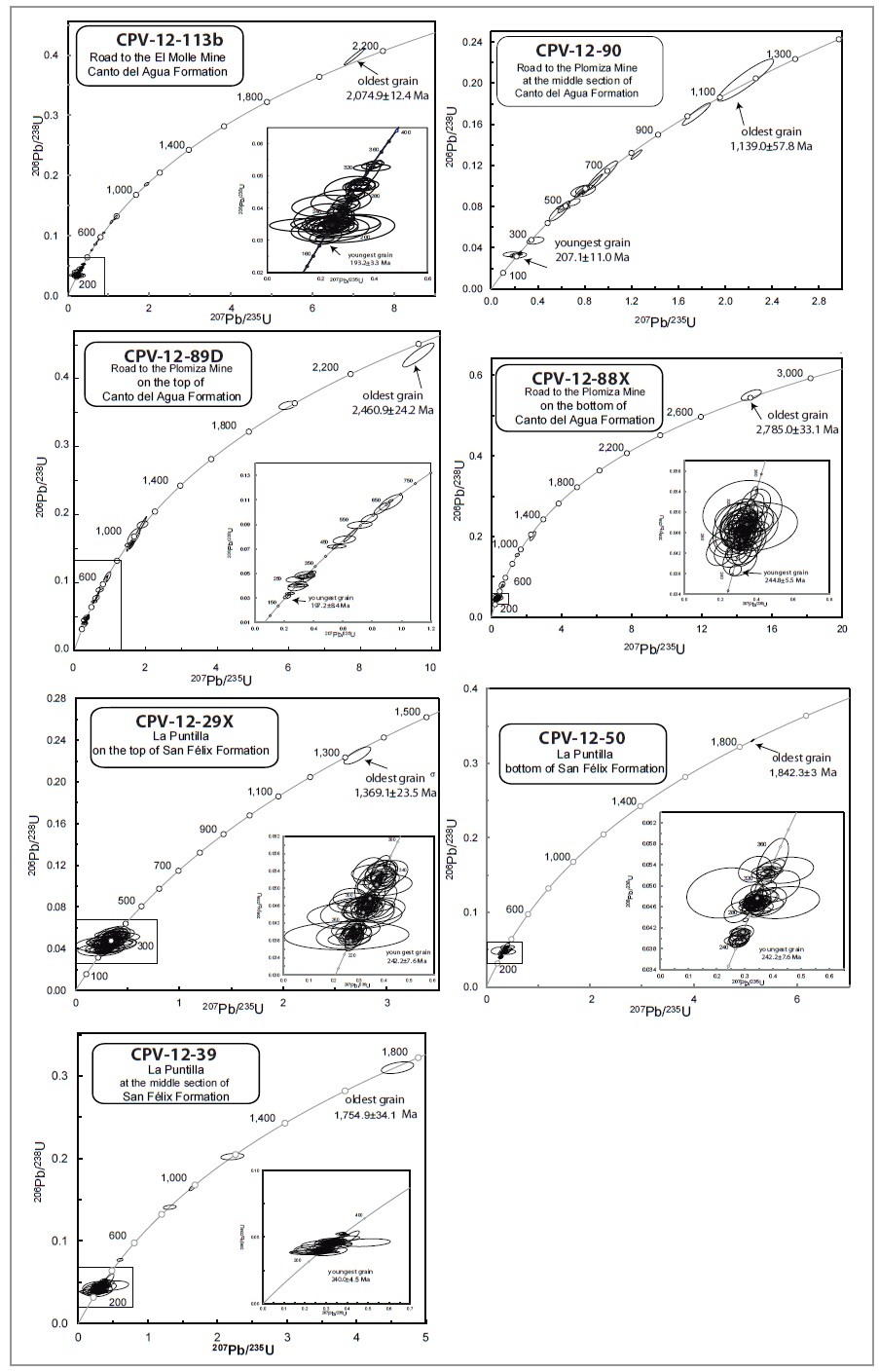 Zircon age distribution (n=20) from an arkose of the middle section (CPV-12-90) show well-defined peaks of 211.9±3.4 Ma, 494.3±11.0 and 585.7±18.0 Ma (Fig. 7). At the top of the type section (CPV-12-89D), the U-Pb age populations (n=33) from an arkose are 212.8±7.3, 259.4±4.0, 299.8±7.0, 454.7±5.6, 665.8±5.8 and 1,050.5±13.0 Ma (Fig. 7). A litharenite from the El Molle mine section (CPV-12-113b) shows well-defined peaks (n=95) at 216.4±2.4 Ma, 224.3±1.1, 252.5±0.8, 268.7±2.2, 294.8±2.0 and 331.4±2.5 Ma (Fig. 7).