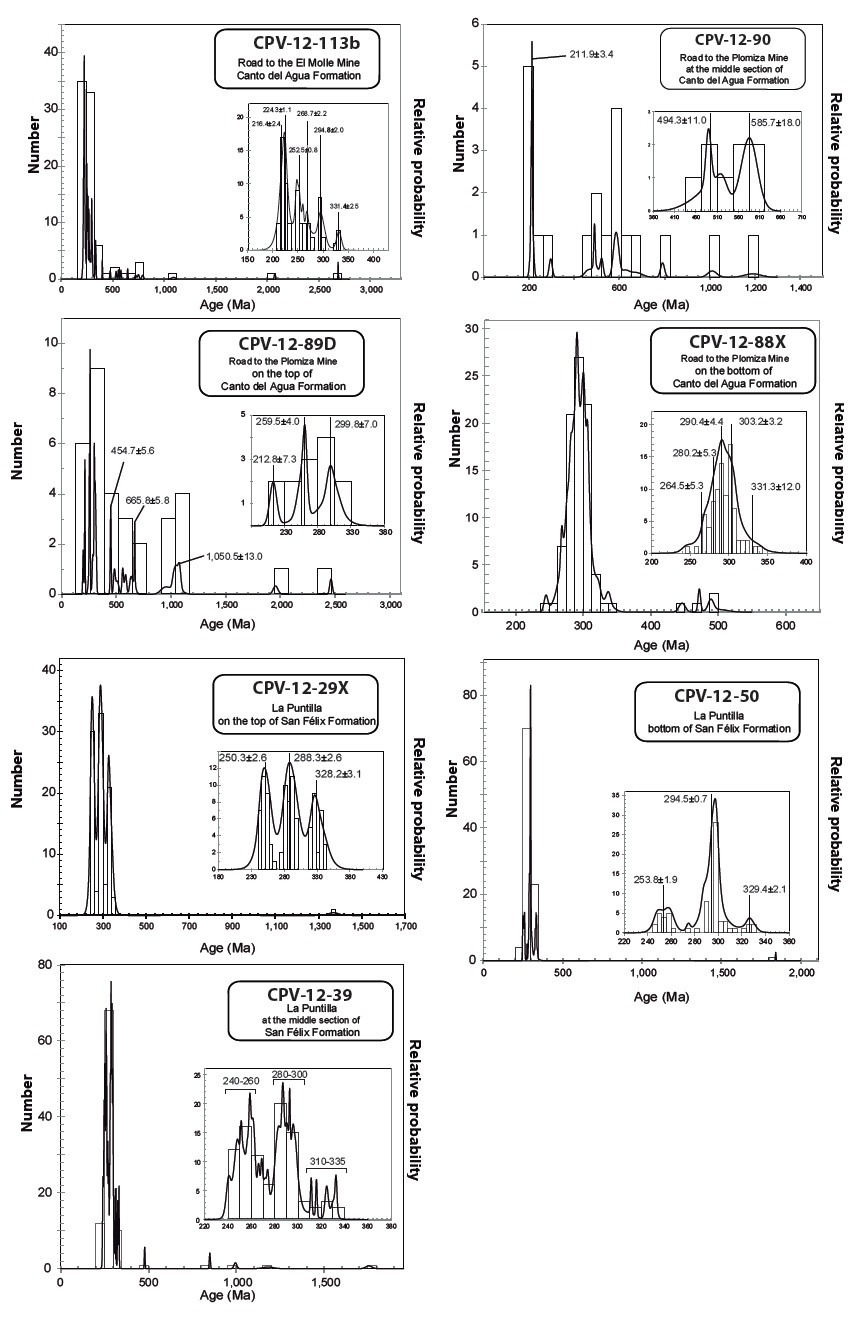 A sandstone from the bottom of the type locality section (CPV-12-88X) yielded five unmixed Permian-Carboniferous age peaks (n=94): 264.5±5.3, 280.2±5.3, 290.4±4.4, 303.2±3.2 and 331.3±12 Ma (Fig. 7), and four dispersed zircons between 450 and 500 Ma.