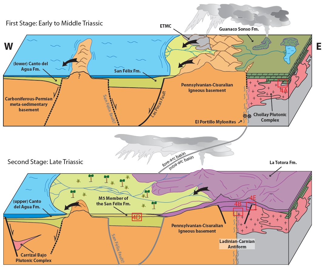 During the first stage (Lopingian-uppermost Middle Triassic), the intra-arc basin is represented by the Guanaco Sonso Formation (253-237 Ma), rooted by the Chollay Plutonic Complex (237-248 Ma) and bounded to the west by a left-lateral shear zone recorded in the EPM (242 Ma). The forearc basin is represented by two extensional marine to transitional depocenters separated by topographic highs, the San Félix basin to the east and the Canto del Agua basin to the west, filled by the homonymous formations. This stage is recorded in members M1 to M4 of the San Félix Formation and in the lower section of the Canto del Agua Formation, both of which carry Anisian fossil fauna and where maximum depositional ages of 254 and 265 Ma were obtained from detrital zircon analyses, respectively. Detrital zircons, clast composition and sediment maturity indicate local sources for both depocenters. Particularly, for the San Félix Formation, the main source of sediment is the Triassic-Paleozoic block located at the footwall of the normal Las Pircas fault that bounds the San Félix basin to the east, with minor inputs from the volcanic activity related to the Guanaco Sonso basin evolution.