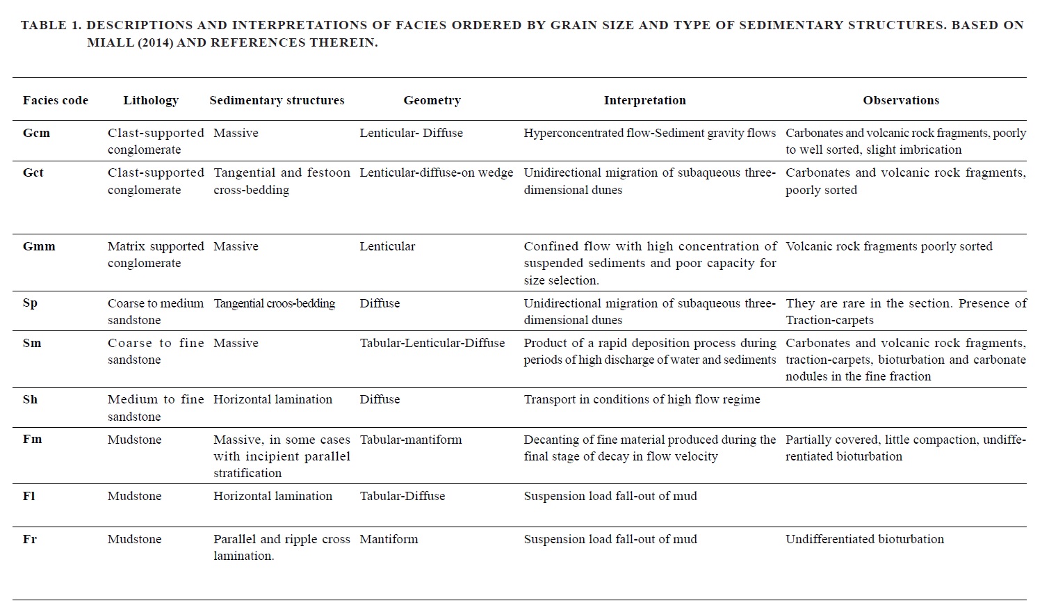The stratigraphic analysis of the non-marine Upper Cretaceous succession was based on the survey of the stratigraphic section at a metric scale in Vega Grande area. Fieldwork included a detailed description of outcrops and measurements of Vega Grande stratigraphic section. Characterization of sedimentary facies was based on lithology, sedimentary structures (types, dimensions and orientation in case of having directional character) and internal organization. The codes system to denominate those sedimentary facies was based on Miall (1996) with slight modifications (Table 1).