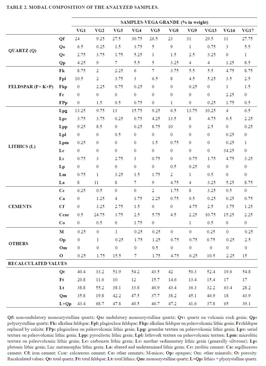 The Upper Cretaceous sandstones of the Diamante Formation in the area of Vega Grande are feldspatic litharenites mainly Q48F16L36 and scarce litharenites Q35F13L52 (Table 2, Fig. 8) with percentages of matrix less than 10% of the whole rock.