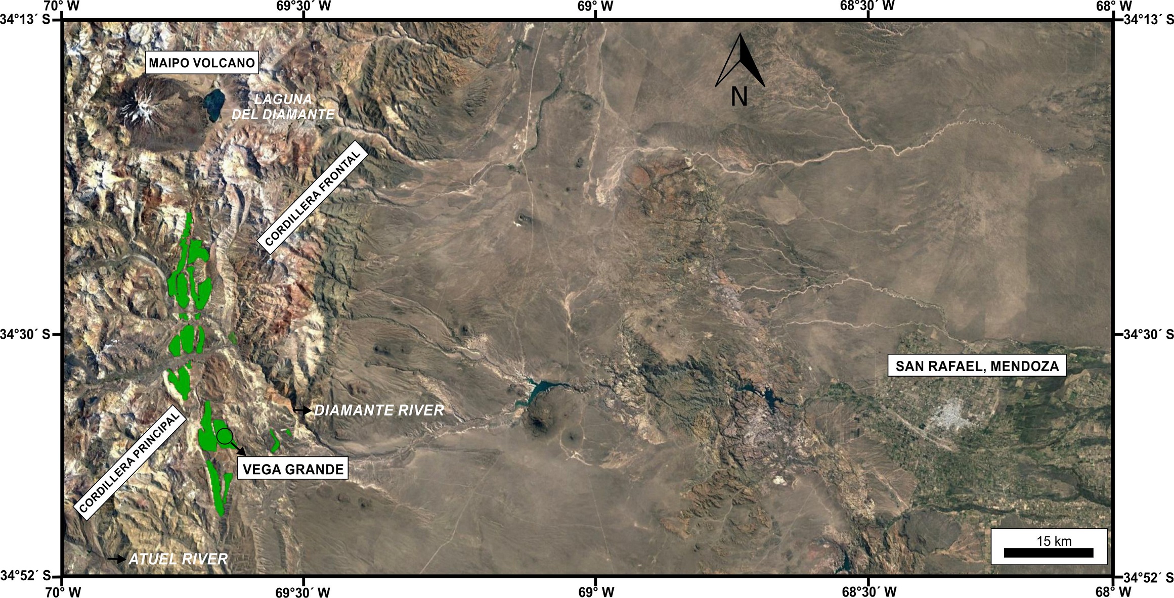 FiG. 2. Detail of the location with the main morpho-structural units, rivers and the city of San Rafael to the right of the map. In green, outcrops of the Diamante Formation between Atuel river and the Laguna del Diamante, Mendoza, Argentina (Satellite image taken from free software Google Earth Pro).