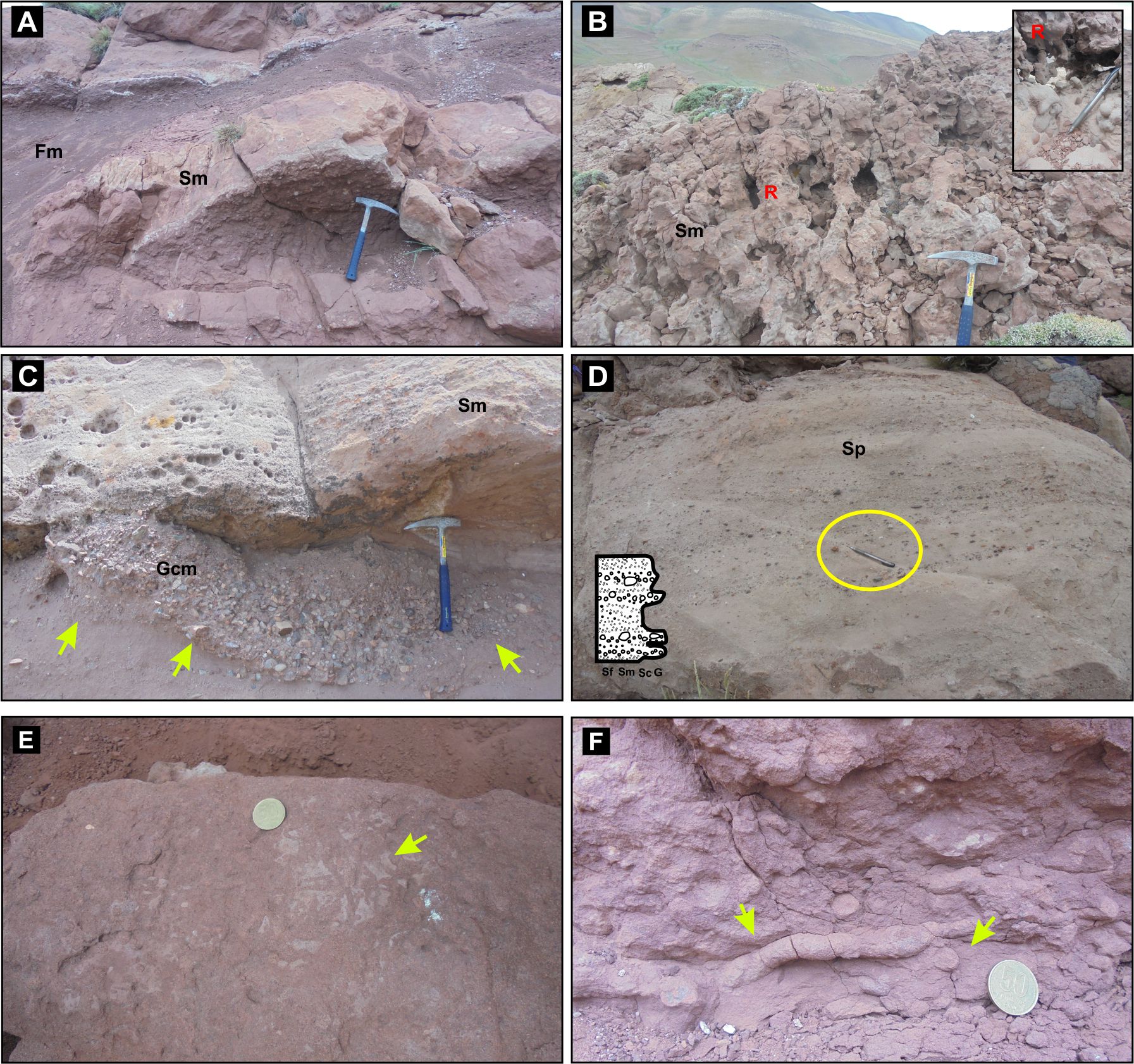 Fig. 4. Field photos of the lithofacies and facies associations present in the study area. A. Massive sandstone facies (Sm) in beds of lenticular geometry interspersed with finer levels of floodplain (Fm); B. Massive sandstone facies (Sm) with rhizoliths (R) on the top of Vega Grande stratigraphic section. Above to the right a detail of trace fossils observed; C. Clast-supported massive conglomerate facies (Gcm) with cutt and fill structures (yellow arrow); D. Tangential cross-bedding sandstone facies (Sp), showing traction-carpets. In the left corner, the schematization of this type of deposit. E-F. Massive sandstone facies (Sm) with horizontal and vertical undifferentiated tubes (yellow arrow).