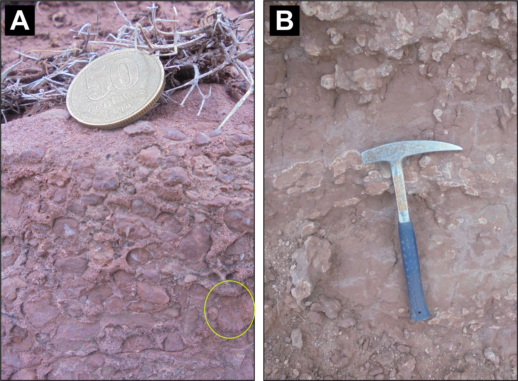 Fig. 6. Field photos of the facies present in the study area. A. Conglomerate composed almost exclusively of carbonate clasts. The yellow circle indicates the presence of an undifferentiated invertebrate remains. B. Carbonate nodules and calcrete levels in floodplain facies