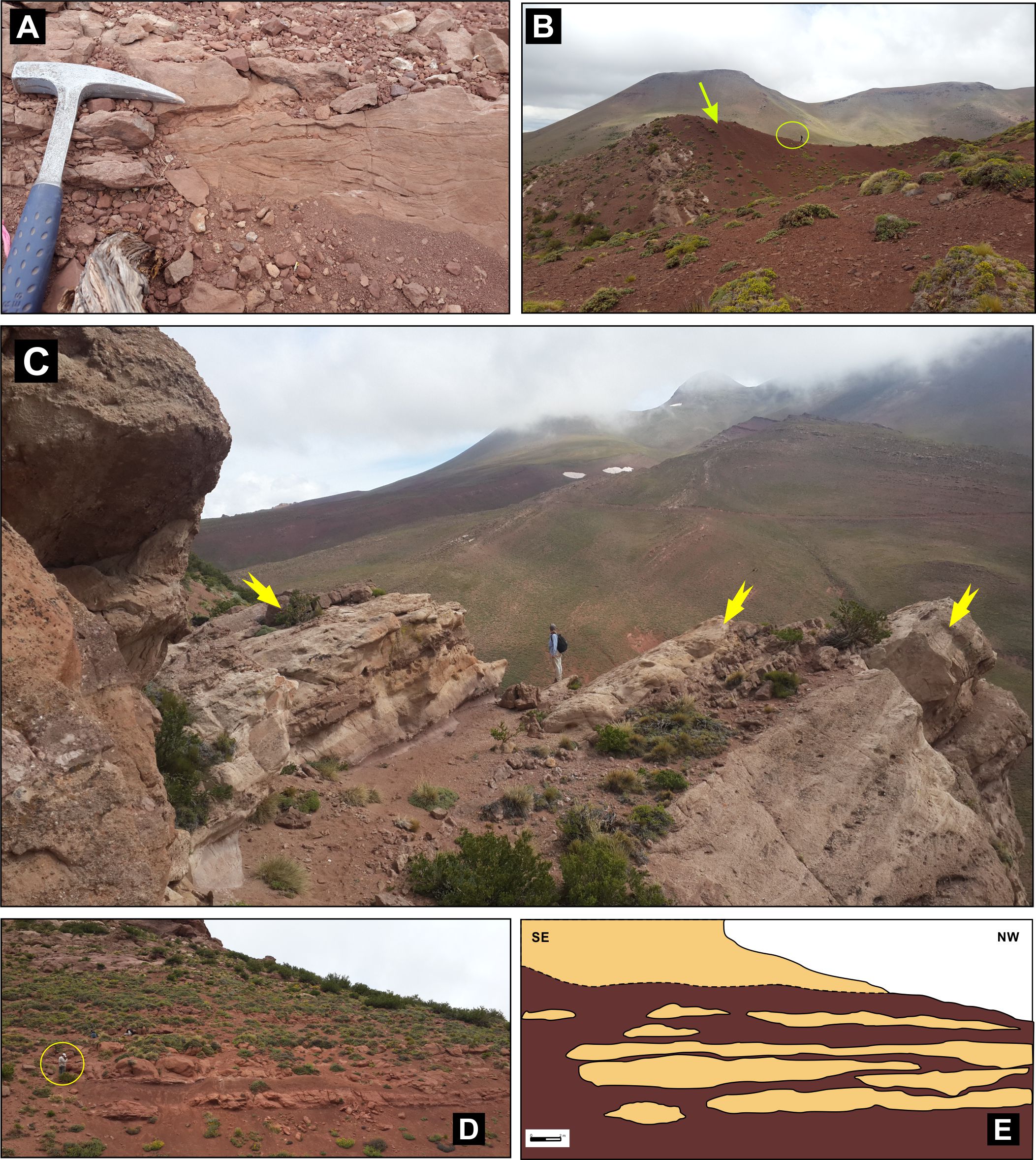 Fig. 7. Floodplain facies association (FA II). A. Parallel lamination and current ripples on sandstone facies; B. Floodplain deposits (yellow arrow) on the top of Vega Grande stratigraphic section (the yellow circle indicates the position of a person 1.80 m tall); C. Stacking of channels and bars (FA I); D. Panoramic view showing the intercalation of the two facies associations present in the study area; E. Redraw of the previous photo. The layout and geometry of the fluvial channels are observed, and how they affect the floodplain. Yellow: Channels and bars facies association; Red: Floodplain facies association.