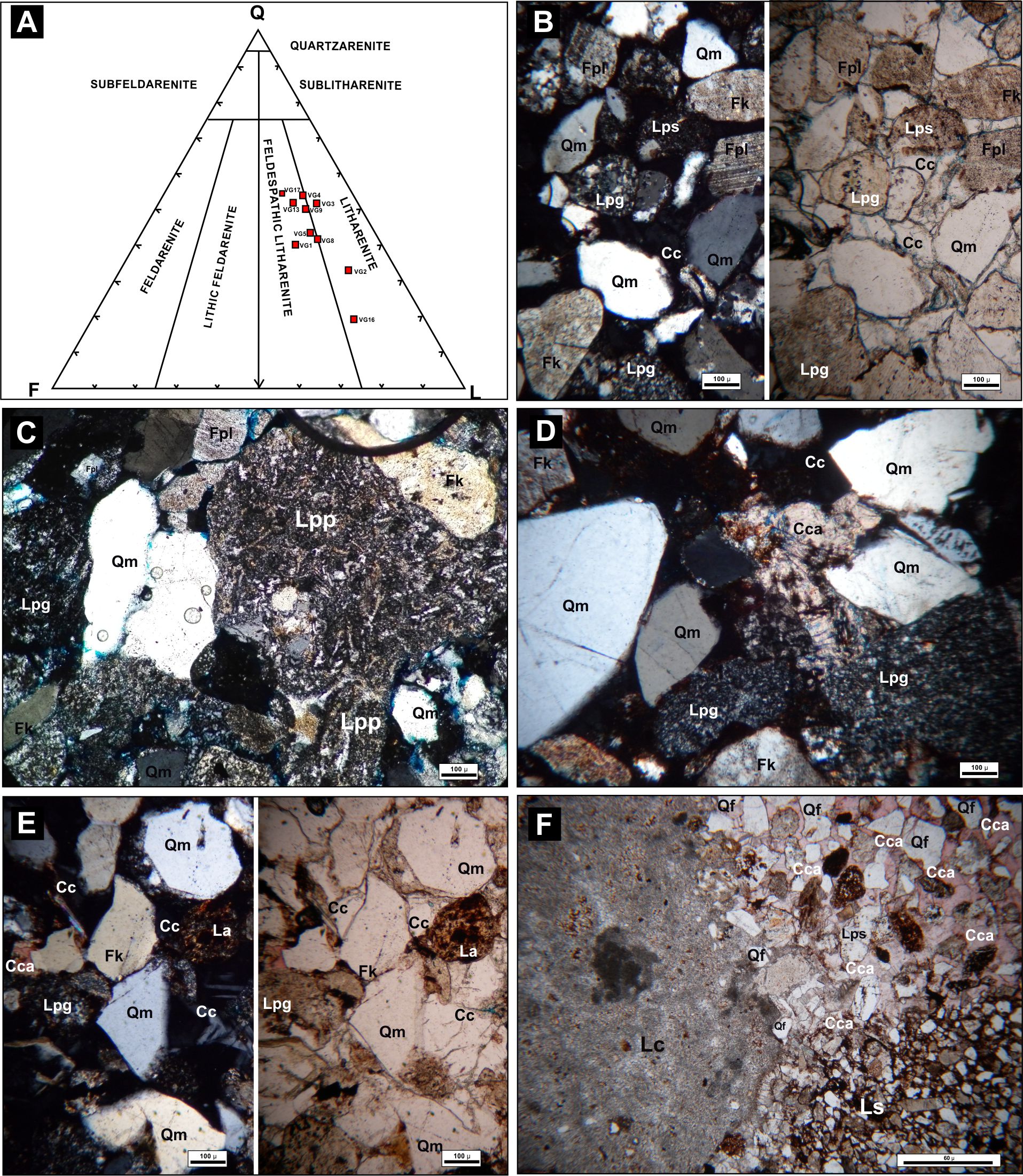 Fig. 8. A. Sandstone classification QFL plot (Folk et al., 1970) of the analyzed samples; B. Photomicrographs of VG1 sample, it is composed of monocrystalline quartz (Qm), alkaline feldspar (Fk), plagioclase (Fpl), granular (Lpg) and serial (Lps) paleovolcanic lithic fragments. It is also observed analcime as a type of zeolitic cement (Cc). Photomicrographs on PN and CN. Scale: 100 microns; C. Photomicrograph of VG4 sample. It is composed of monocrystalline quartz (Qm), alkaline feldspar (Fk), plagioclase (Fpl) and pyroclastic paleovolcanic lithic fragment (Lpp), with altered vitreous shard. Photomicrographs on CN. Scale: 100 microns; D. Photomicrograph of VG8-16 sample. It is composed of monocrystalline quartz (Qm), alkaline feldspar (Fk), granular paleovolcanic lithic fragment (Lpg), zeolitic cement (Cc) and calcite cement (Cca). Scale: 100 microns; E. Photomicrographs of VG9 sample. It is composed of monocrystalline quartz (Qm), alkaline feldspar (Fk), altered lithic fragment (La) and granular paleovolcanic lithic fragment (Lpg). Photomicrographs on PN and CN. Scale: 100 microns; F. Photomicrograph of VG16-16 sample. It is made of high percentage of limestone fragments (Lc). Scale: 60 microns. PNP: parallel nichols; CN: crossed nicols.