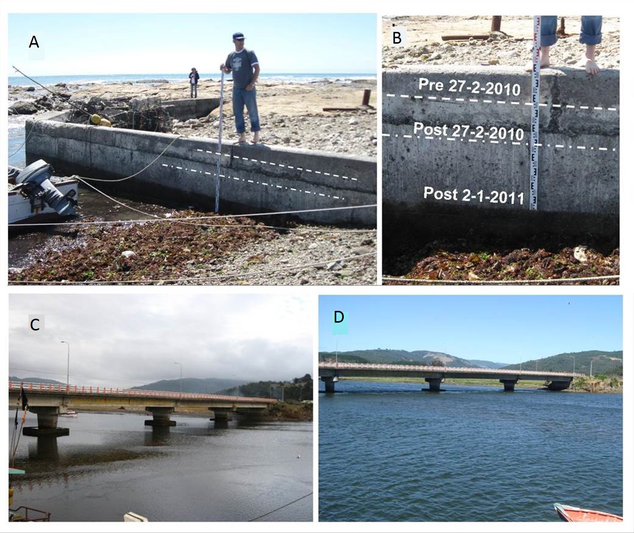 Fig. 9. Evidences of vertical changes at Mocha Island and Tirúa after Araucanía 2011 earthquake. A-B. Same place at Mocha Island shown in figure 7D. It is clear the sea level drop of 50 cm. C-D. Tirúa bridge. Left photo taken on April 27th 2010 one hour after the low tide. Right photo: same view on January 20th 2011 at the time of low tide. Note the upper position of the water in the columns evidenced 20 cm of subsidence after the Mw=7.1 event. The Tirúa River had more caudal on January 2011, even if we consider that this is the summer dry season.