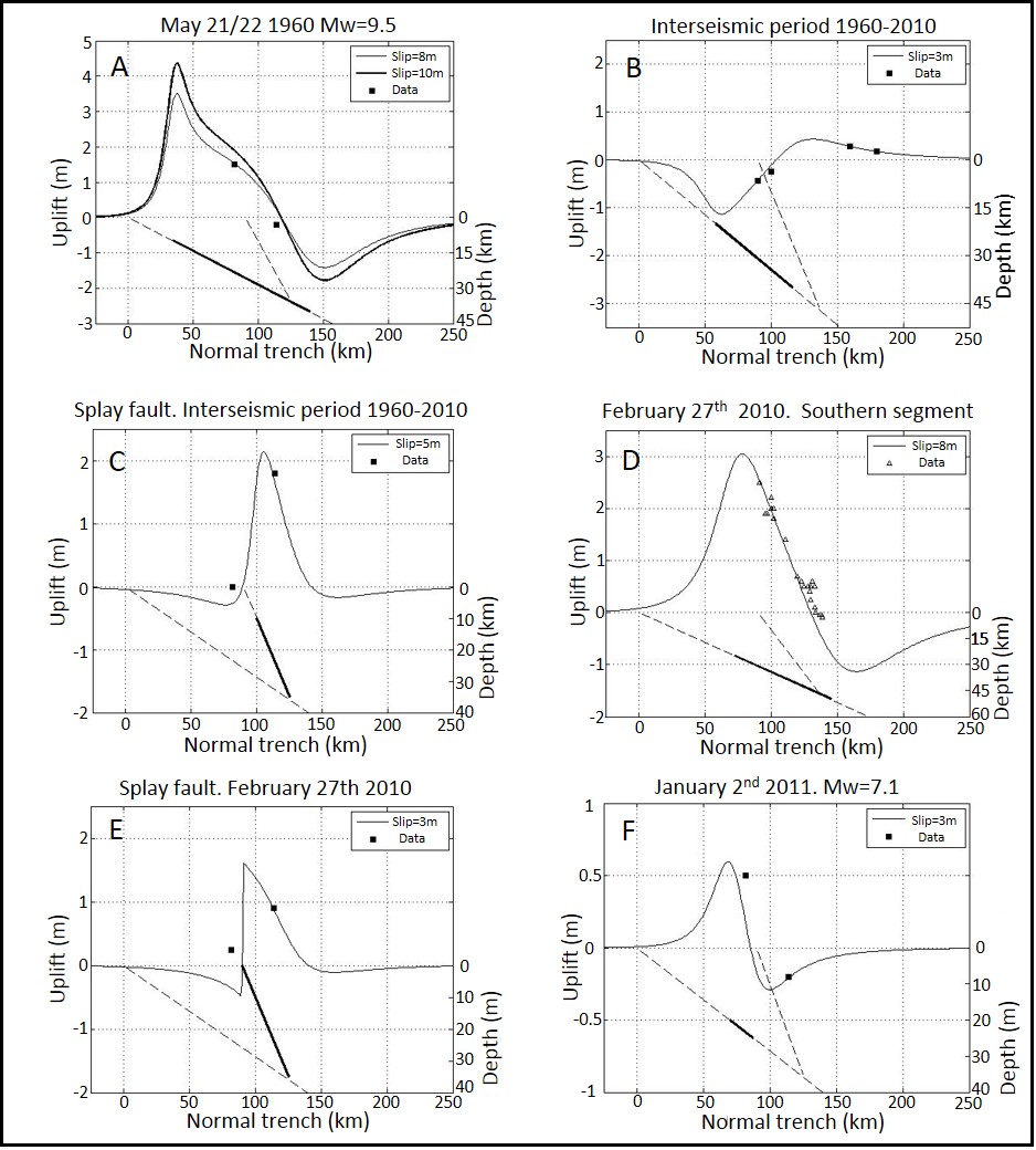 Fig. 10. Elastic dislocation models of vertical coseismic and interseismic movements considering the Wadati-Benioff plane and the Tirúa-Mocha Splay fault (with bigger dip). In each case the fault modelled is displayed as a thick solid line. A. Coseismic uplift/subsidence Valdivia 1960 earthquake at Tirúa and Mocha Island area, movement only along Wadati-Benioff. B. Interseismic period 1960-2010 at 37.1° S; movement only along Wadati-Benioff. C. Interseismic period 1960-2010 at Tirúa-Mocha Island area considering activity of Tirúa-Mocha Splay fault. D. 2010 coseismic uplift/subsidence Maule earthquake at southern segment (36° S-38.1° S); movement only along Wadati-Benioff. E. 2010 coseismic uplift Maule earthquake at Tirúa-Mocha Island area with activity of the Tirúa-Mocha Splay fault. F. Coseismic Mw=7.1 event of January 2nd 2011 considering movement at updip of Wadati-Benioff plane.