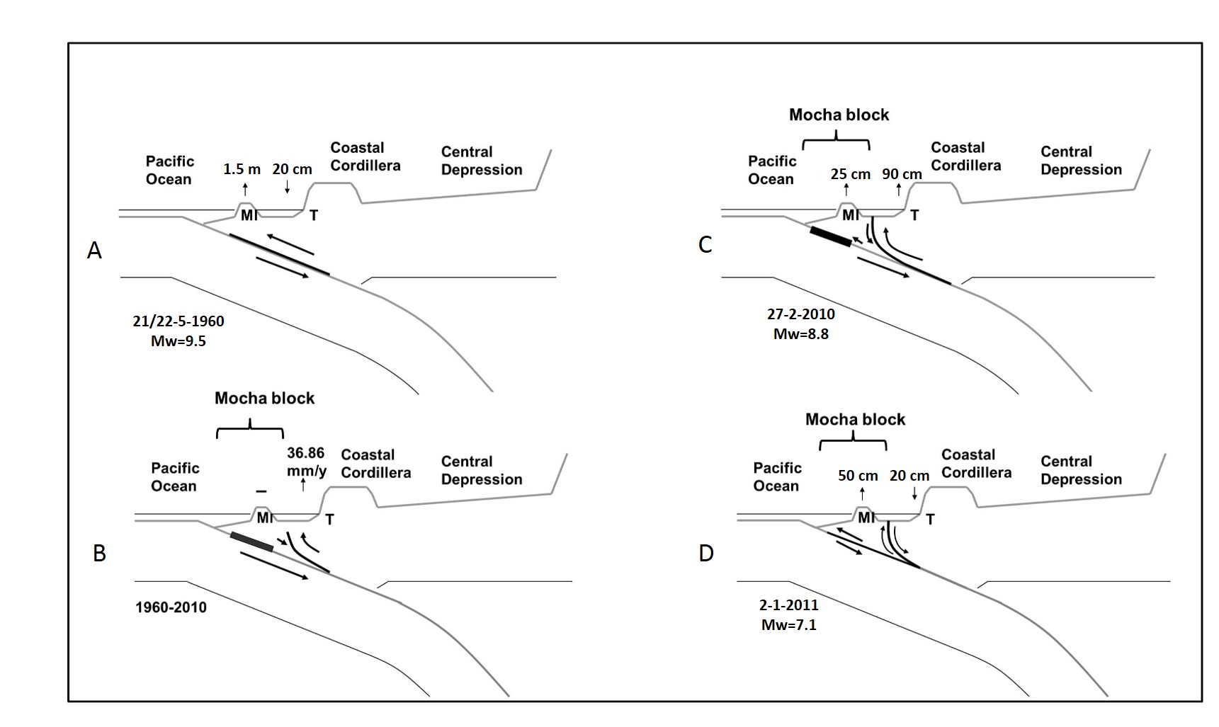 Fig. 11. Tectonic evolution of the Tirúa-Mocha Island zone in the last seismic cycle. A. 1960 coseismic movement along Wadati-Benioff plane. B. 1960-2009 interseismic movement. Strong asperity along the up dip of Wadati-Benioff zone (black rectangle), development of Mocha-Tirúa splay fault, vertical stability at Mocha Island and big uplift at Tirúa. C. Maule earthquake coseismic movement. Main slip along Tirúa-Mocha splay fault. Strong asperity (black rectangle) remained at the up dip of Wadati-Benioff plane. D. Removal of that asperity during the Araucanía 2011 earthquake, thrust movement at updip of Wadati-Benioff plane and normal reactivation of Tirúa-Mocha splay fault. Mocha block is displayed. T: Tirúa, MI: Mocha Island.