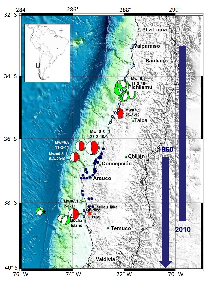 Abstract: The Tirúa-Mocha Island area (38.2°-38.4° S) in southern Chile has been affected by two megaearthquakes in only 50 years: the 1960 Mw=9.5 Valdivia earthquake and 2010 Mw=8.8 Maule earthquake. We studied in the field the vertical ground movements occurred during the interseismic period between both earthquakes and the coseismic period of 2010 Maule earthquake and 2011 Mw=7.1 Araucanía earthquake. During the 1960 earthquake, vertical coseismic ground movements are typical of subduction related earthquakes with Mocha Island, located close to the trench, experienced bigger ground uplift (150 cm) than that occurred in Tirúa (-20 cm), place located in the continental margin at the latitude of Mocha Island. Then during the 1960-2010 interseismic period, the 1960 coseismic uplift remained at Mocha Island unlike the normal interseismic subsidence that occurred northward at Arauco Peninsula and Santa María Island. Also Tirúa experienced the biggest interseismic uplift (180 cm) in all the area affected later by 2010 Maule earthquake. Then during the 2010 Mw=8.8 Maule earthquake an anomalous vertical coseismic ground uplift occurred in the study area, opposite to that of 1960 since Mocha Island experienced lower (25 cm) ground uplift than Tirúa (90 cm). Subsequently, during the Araucanía 2011 earthquake a ground uplift in Mocha Island (50 cm) and subsidence at Tirúa (20 cm) occurred. These unexpected vertical ground movements can be explained by the existence of an upper plate splay fault located below the sea bottom between Tirúa and Mocha Island: the Tirúa-Mocha splay fault. Considering the last seismic cycle, the activity of this fault would have started after the 1960 Valdivia earthquake. During 2010 Maule earthquake, the main slip occurred at Tirúa Mocha splay fault. Finally during 2011 Araucanía earthquake, the slip occurred mainly at the updip of Wadati-Benioff plane with probable normal activity of Tirúa-Mocha splay fault. Simple elastic dislocation models considering the Wadati-Benioff plane and the Tirúa-Mocha splay fault activity, can account for all the vertical ground movements observed during 1960 earthquake, the 1960-2010 interseismic period, the 2010 Maule earthquake and the 2011 Araucanía earthquake.