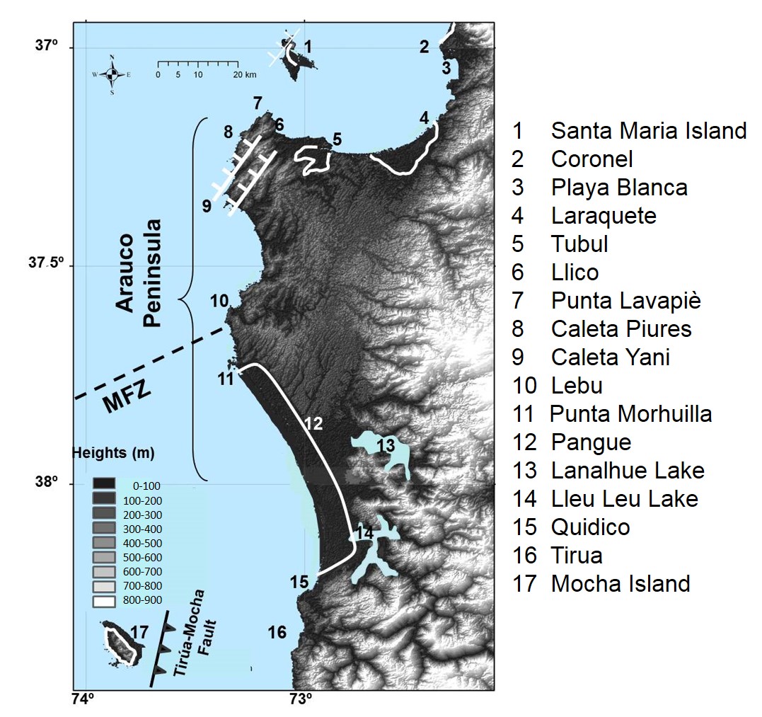 Fieldwork was carried out between 2007 and 2009 in the coast of Biobío Region of Chile (36.8° S-38.4° S) including the Santa María Island, Mocha Island and Arauco Peninsula (Fig. 3). The Holocene shoreline angles (angle between the cliff and flat surface in an uplifted marine terrace) measured with differential GPS are: 9.5 m a.s.l. at Pangue (37.84° S); 8.3 m a.s.l. at Santa María Island (37° S), and 4 m a.s.l. in the continental margin in the eastern coast of Arauco Gulf at 37° S-37.2° S (Fig. 3). At Mocha Island we corroborated the 33 m a.s.l. of the shoreline angle of the highest Holocene terrace located at the northern border of Mocha Island at Cerro Los Chinos, and we observed the layer of mollusk shells that Nelson and Manley (1992) dated in 6,100-5,480 years (calibrated age).