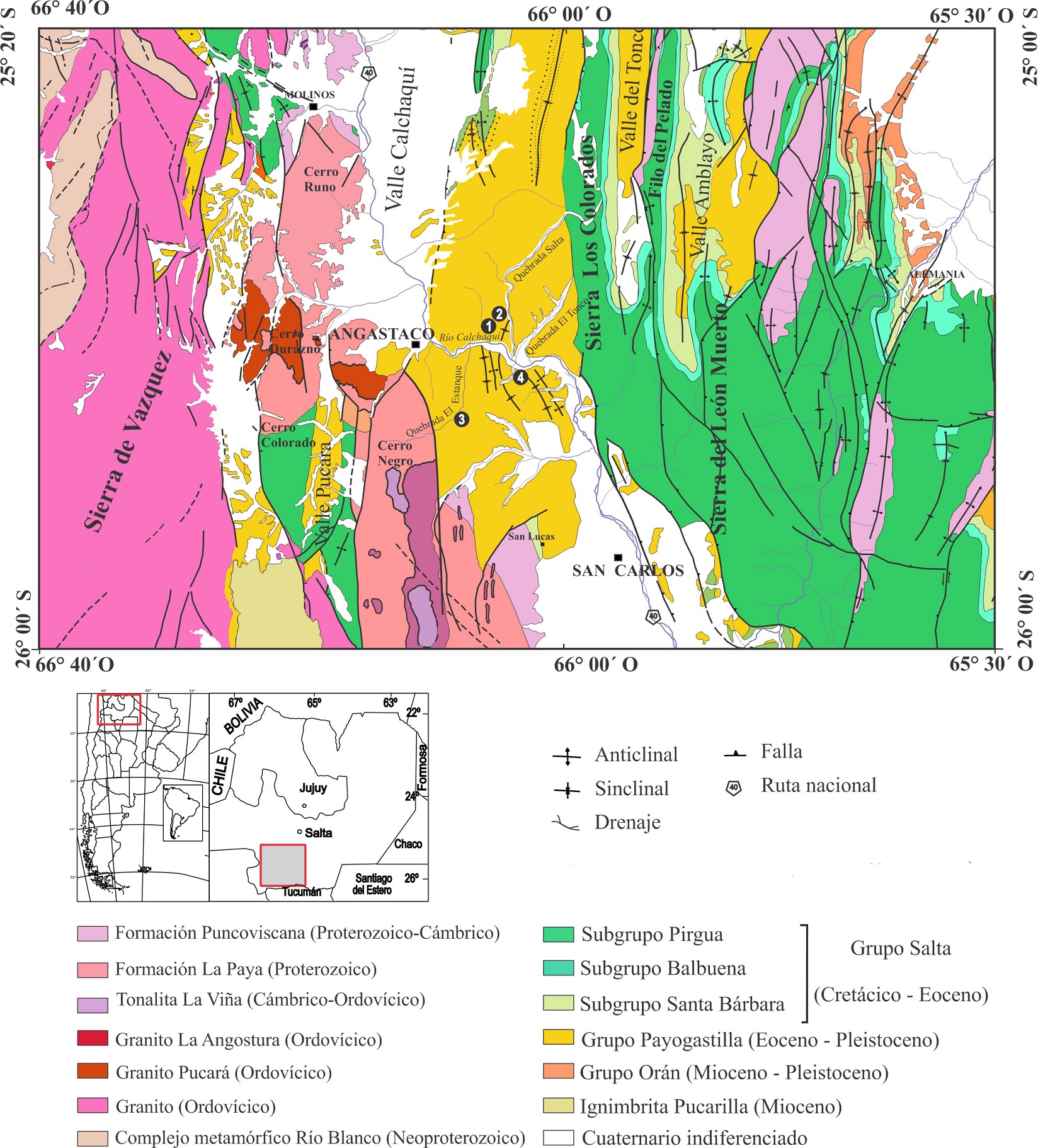 FIG. 1. Mapa geológico que señala la ubicación de las localidades donde provienen las muestras. 1. Peñas Blancas; 2. Quebrada Salta; 3. Quebrada El Estanque; 4. Quebrada del Horno. Modificado de Hong y Seggiaro (2001) y Salfity y Monaldi (2006).