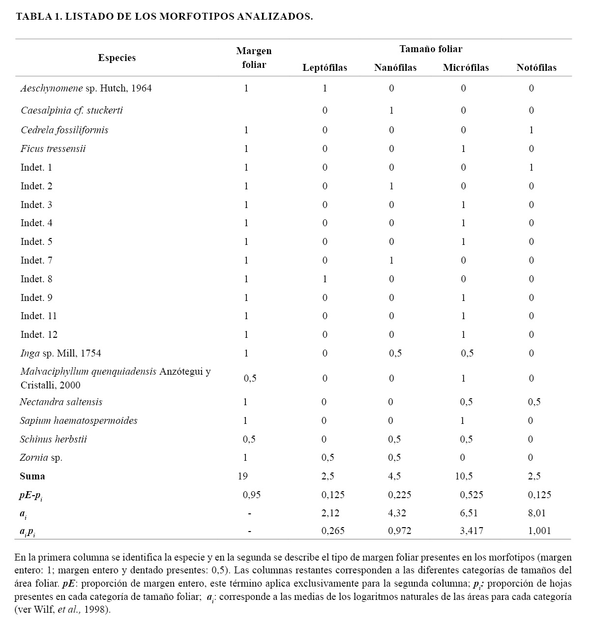 Se analizaron 20 morfotipos de hojas (Tabla 1), algunas ya identificadas, las que presentan mayormente márgenes enteros y tamaños de áreas que varían desde leptófilas a notófilas (Fig. 2); se observa mayor proporción de micrófilas (0,525), seguidas de las nanófilas (0,225). La TMA obtenida es de 23,98 °C, con un error estándar (ES) de 1,16 °C. Los valores de TMA conseguidos mediante las diferentes ecuaciones propuestas por otros autores arrojan una temperatura máxima de 30,21 °C y un promedio de 26,66 °C. El MlnA es de 5,65 mm2, mientras que el valor de la PMA corresponde a 33,08 cm (Tabla 2). Por otro lado, en la tabla 1 se observa que en la lista taxonómica se encuentran identificadas solo 10 especies, mientras que 12 restan aún por identificar, a las que se suman frutos, semillas y hojas de monocotiledóneas.