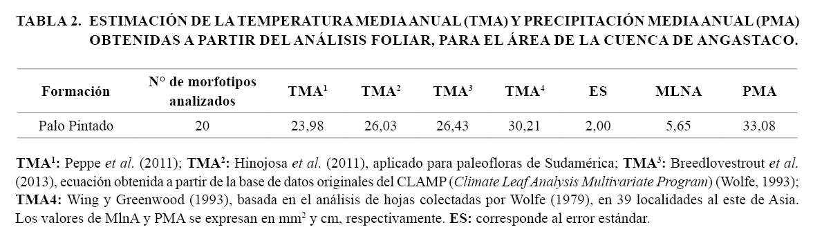 En el estudio realizado por Wilf et al. (1998), se analizaron las áreas foliares de ejemplares provenientes de 50 sitios actuales en Estados Unidos, África, América Central y Sudamérica. Una de esas muestras fue colectada en el bosque del Chaco Occidental (Sarmiento, 1972), lo que correspondería a la región del “Chaco Salteño”. Si se comparan los resultados obtenidos por Wilf et al. (1998) con los de este trabajo, los valores son similares. La PMA para la región del bosque chaqueño es de 450-700 mm, mientras que en este estudio la PMA indicada por la flora fósil contenida en las rocas de la Formación Palo Pintado es de 330,8 mm. De la misma forma, el MlnA (ln del área foliar) es de 5,85 mm2 para el primer caso y 5,65 mm2 para el segundo. Por último, la TMA actualmente en la región es de ~20 °C (Bianchi y Yáñez, 1992), mientras que en la que se depositaron las rocas de la Formación Palo Pintado era de 23,98 °C. Estos resultados confirmarían la interpretación de algunos autores (Herbst et al., 1987; Acevedo et al., 1997; Starck y Anzótegui, 2001; Anzótegui, 2006; Galli et al., 2011) que consideran que la secuencia sedimentaria incluida en la Formación Palo Pintado se habría depositado bajo un clima semejante al que se manifiesta en la región del Chaco Occidental.
