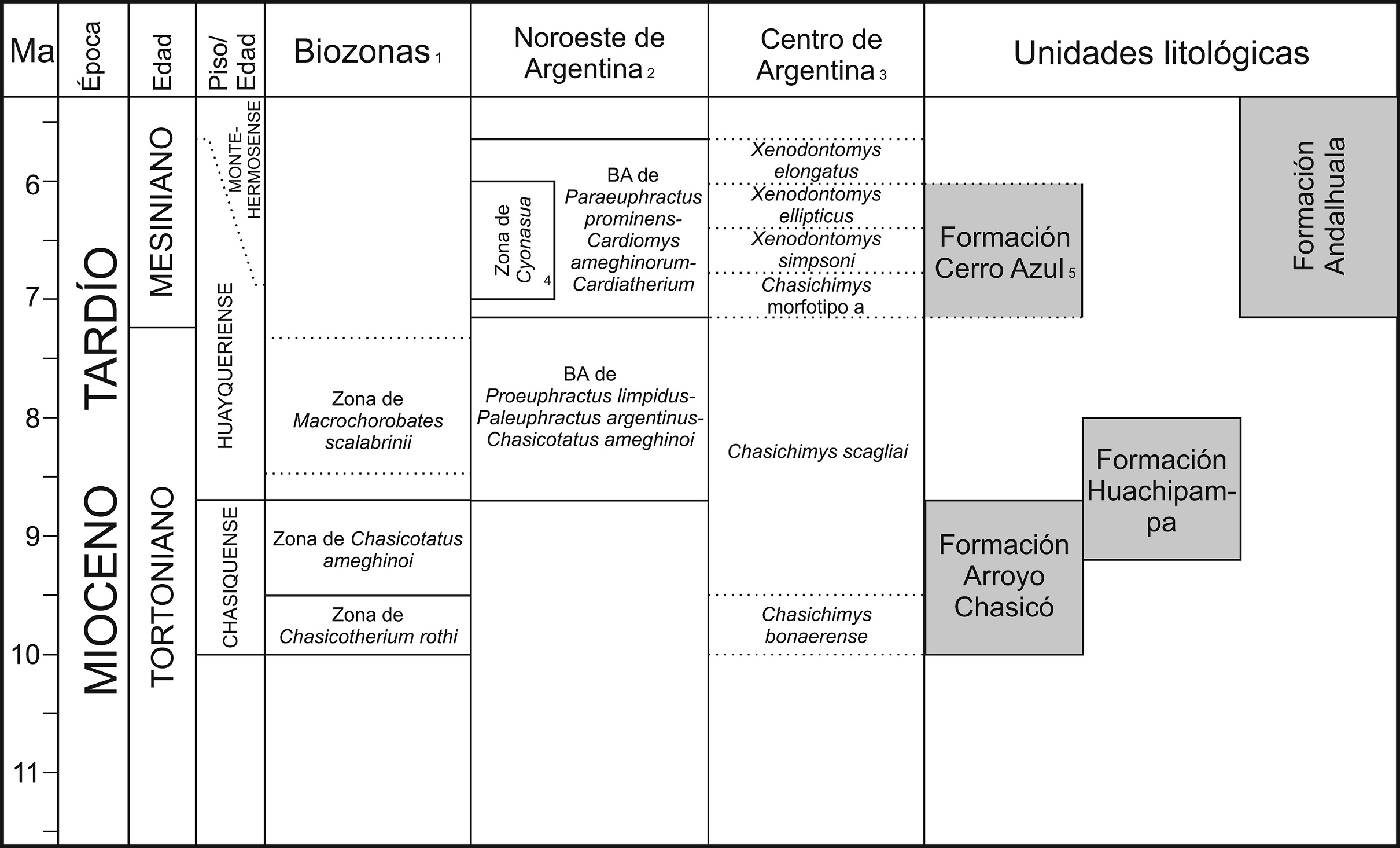 Verzi, D.H.; Deschamps, C.M.; Montalvo, C.I. 2004. Bioestratigrafía y biocronología del Mioceno tardío de Argentina central. Ameghiniana 41 (4): 21R.