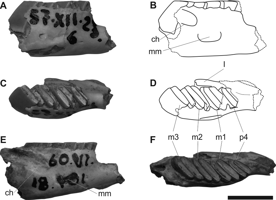 FIG. 3. Material de Lagostomus telenkechanum. A-D. MLP-Pv 57-XII-23-6, mandíbula derecha en vista lateral (A-B) y oclusal (C-D), proveniente de la Formación Huachipampa, San Juan. E-F. MLP-Pv 60-VI-18-101, mandíbula derecha en vista lateral (E) y oclusal (F), proveniente de la Formación Arroyo Chasicó, Buenos Aires. Abreviaturas: I: incisivo; m1: primer molar; m2: segundo molar; m3: tercer molar; mm: muesca masetérica; p4: cuarto premolar. Escala 1 cm.