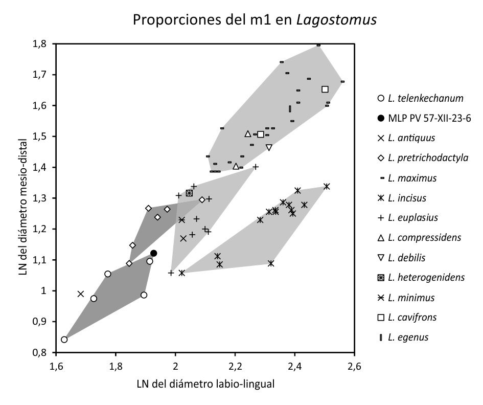 Las proporciones de los molariformes superiores son semejantes a aquellas de los especímenes de Lagostomus pretrichodactyla reportados por Rovereto (1914) y Marshall y Patterson (1981) para la provincia de Catamarca (ver Tabla 2 y Figs. 5C, 5D, 5H y 6), aunque son menos comprimidos mesio-distalmente que los de L. telenkechanum, L. euplasius y L. incisus; se asemejan a los de L. compressidens, L. cavifrons y L. maximus.