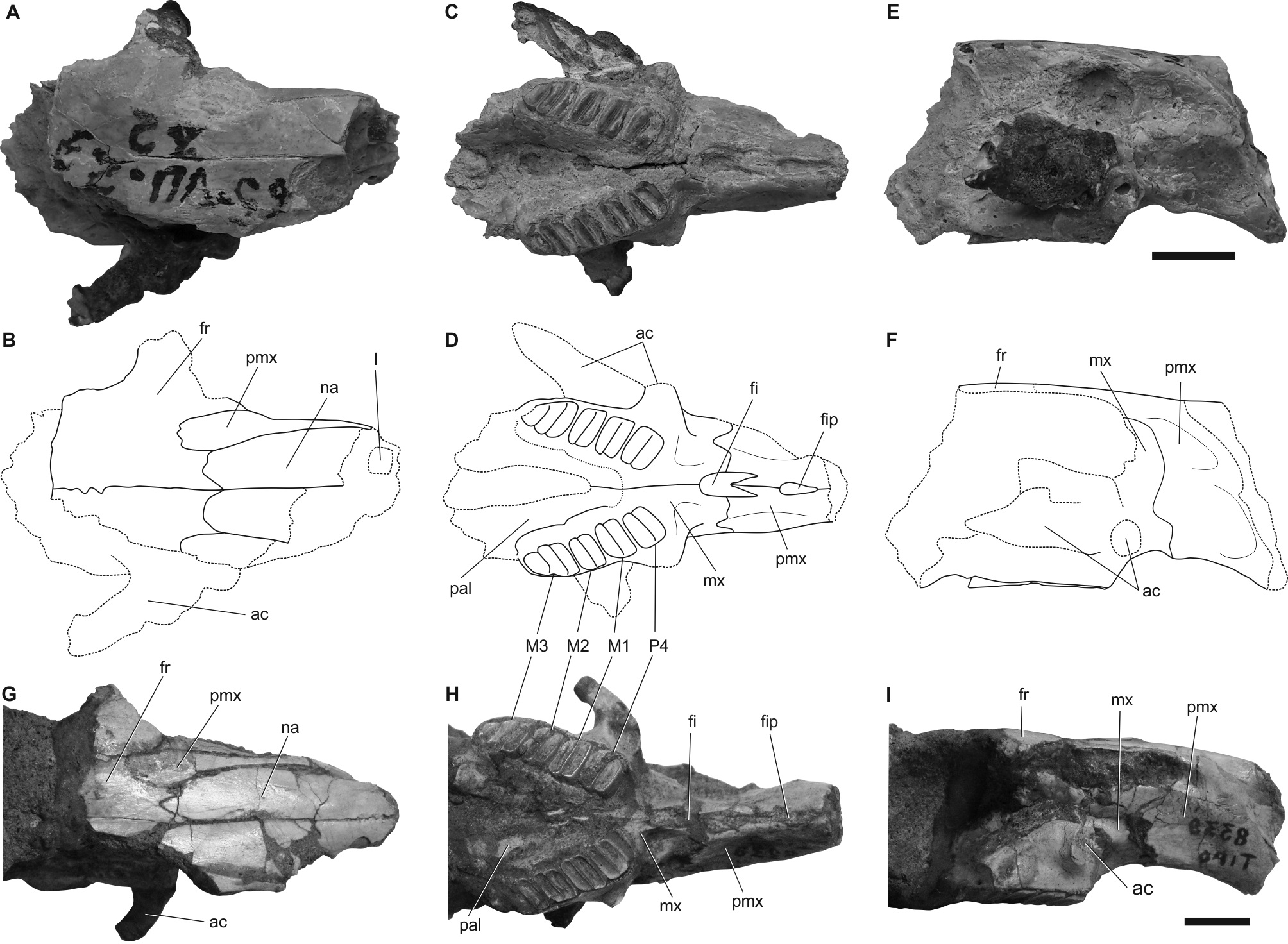 FIG. 5. Material de Lagostomus pretrichodactyla. A-F. MLP-Pv 65-VII-29-72, de la Formación Cerro Azul, La Pampa, en vista dorsal (A-B), ventral (C-D) y lateral (E-F). G-I. MACN-Pv 8339 (holotipo), del “Araucanense” de Catamarca, en vista dorsal (G), ventral (H) y lateral (I). Abreviaturas: ac: arco cigomático; fi: foramen incisivo; fip: foramen interpremaxilar; fr: rrontal; I: incisivo; M1: primer molar; M2: segundo molar; M3: tercer molar; mx: maxilar; na: nasal; pal: Palatino; P4: cuarto premolar; pmx: premaxilar. Escala 1 cm.