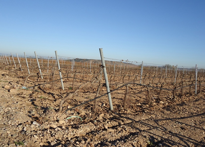 La expansión del viñedo en espaldera ha generado nuevos paisajes. La morfología de un viñedo en espaldera es muy distinta a la de uno en vaso. La superficie sin cubrimiento entre las hileras es mayor, a lo que se le añade la utilización de postes, de alambres y de conducciones de riego por goteo que condicionan la disposición emparrada de los sarmientos. Entre las ventajas de los viñedos en espaldera hay que destacar la reducción de los costes de producción, en relación con una mayor facilidad para mecanizar algunas tareas, como -por ejemplo- la vendimia. La espaldera permite también incrementar la densidad de cepas (la separación entre ellas en las hileras se reduce a unos 80-90 cm), una mayor eficacia de los tratamientos sanitarios, la disminución del riesgo de padecer ciertas enfermedades relacionadas con el exceso de humedad como el mildiú, la mejor maduración de la uva al recibir mayor insolación, la más fácil conducción de las mangueras de riego, etc. (Ruiz Pulpón, 2013). Sin embargo, el viñedo en espaldera también ocasiona algunas desventajas. Así, el incremento de la densidad de cepas ocasiona mayor estrés a las vides y una longevidad más corta, vino de menos calidad en relación con una mayor productividad y con la menor selección de los racimos en la recolección mecánica. Por otro lado, la espaldera requiere más agua que el viñedo en vaso, siendo además más sensible a los periodos secos y a los vientos racheados (Ruiz Pulpón, 2013). Otras desventajas se relacionan con el impacto visual generado en el paisaje. En este sentido, hay que tener en cuenta que la conducción de un viñedo en espaldera introduce una estructura hecha de alambre y postes de madera o de chapa de acero plegada y galvanizada. Si, además, la viña se riega, un tubo portagoteros recorre las hileras de vides, unas veces junto al suelo y otras a 30-40 cm del suelo. La estructura queda oculta por la parra entre junio y octubre, pero el resto del año, especialmente en invierno (Foto 6), sobre vastas extensiones puede observarse un entramado de cables, postes y mangueras que restan estética al paisaje, especialmente cuando se emplean postes de chapa (Lasanta y Ruiz-Flaño, 2014).