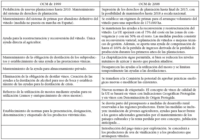 La OCM vitivinícola de 1999 tuvo su continuación en la OCM de 2008 (Reglamento CE Nº 479/2008). La modificación más importante fue la sustitución de los mecanismos de mercado por unas medidas de apoyo al sector, a ejecutar por los Estados miembros con fondos comunitarios asignados a cada uno. Entre las medidas más interesantes figuraban la promoción de los vinos europeos en terceros países, la continuación de las políticas de reestructuración y reconversión, la implantación del arranque subvencionado, la supresión de las medidas de apoyo al mercado para destinar esos fondos a la mejora de la calidad, el impulso al desarrollo rural, facilitando la instalación de jóvenes agricultores, y la potenciación del tejido social y medioambiental de las áreas rurales (Cañizares Ruiz y Ruiz Pulpón, 2014). Hay que resaltar que la OCM vitivinícola de 2008 combinaba objetivos orientados a ser más eficientes en los mercados, en parte por la competencia creciente de los vinos del llamado “Nuevo Mundo”, con otros destinados a atender aspectos sociales y medioambientales de unos espacios rurales afectados por la despoblación (Albisu, 2009).