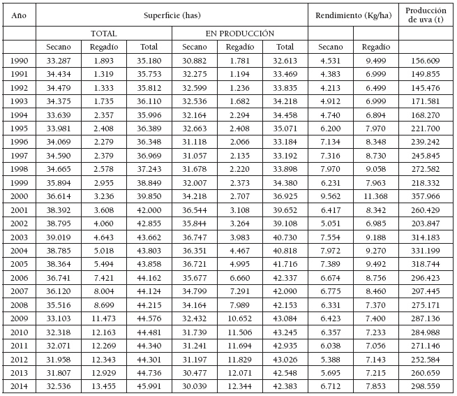 La Tabla 2 muestra que la superficie de viñedo en regadío en La Rioja se ha incrementado considerablemente en los últimos 24 años. Aunque el riego estuvo prohibido entre 1979 y 2003, las viñas no desaparecieron totalmente de los polígonos de regadío, si bien no se regaban al menos legalmente. En 1991 el viñedo en regadío ocupaba 1.319 ha (el 3,7% de la superficie total), iniciando un ascenso moderado hasta 2002 (4.060 ha). A partir de esta fecha, la superficie de viñedo en regadío se ha multiplicado por 3,3 hasta ocupar 13.455 ha en 2014 (el 29,3% de la superficie total), mientras que el de secano se contraía el 16,4%, pasando de 39.019 ha en 2003 a 32.536 ha en 2014. Estos cambios en la distribución espacial del viñedo han ayudado al incremento de los rendimientos y de la producción de uva. Aunque la variabilidad interanual es elevada (ligada a circunstancias climatológicas, sanitarias, etc.) resulta evidente que el viñedo de regadío incrementa la productividad con valores promedio, en el periodo 1990-2014, de 8.084 Kg de uva por hectárea (valor máximo de 11.362 kg/ha y mínimo de 6.499 kg/ha). Los rendimientos en secano se reducen a 6.319 kg/ha como promedio (valor máximo de 9.562 kg/ha y mínimo de 4.213 kg/ha), lo que representa el 22% menos que en regadío. Lógicamente la producción de uva muestra una tendencia creciente desde los años noventa (Tabla 2).