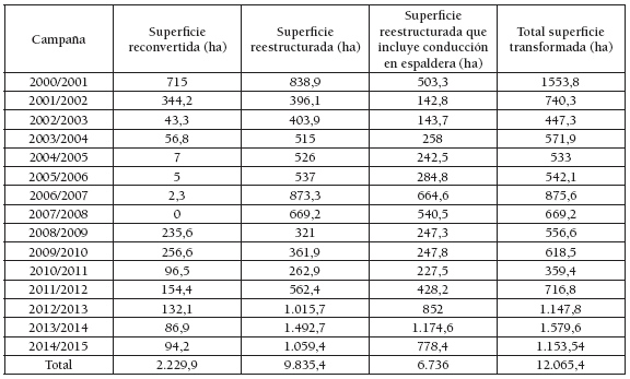 La tabla 3 incluye información sobre el viñedo reconvertido y reestructurado en La Rioja en el marco de las OCM vitivinícolas de 1999 y 2008. El viñedo transformado con subvenciones públicas entre 2000 y 2015 asciende a 12.065,4 ha (el 27,8% del viñedo inscrito en la DOCaRioja), de las que 9.835,4 ha se han reestructurado y 2.229,9 ha se han reconvertido. Hay que anotar que en los últimos años los viticultores se decantan claramente por la reestructuración, superando las 1.000 ha/año desde la campaña 2012-2013. Por otro lado, hay que destacar que el 68,5% del viñedo reestructurado se conduce en espaldera, lo que unido al viñedo reconvertido hace que 9.865,9 ha se hayan transformado con ayudas públicas al sistema de espalderas en los últimos 15 años. A esta superficie hay que sumar la realizada por los viticultores con financiación propia, estimándose que más del 50% del viñedo de La Rioja se cultiva en la actualidad en espaldera.