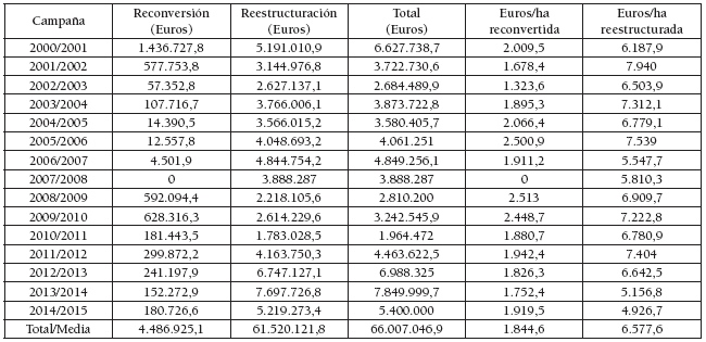 Tanto en la reconversión como en la reestructuración los viticultores cuentan con subvención para sufragar parte de los costes de arranque, despedregado, preparación del suelo, nivelación, plantación, desinfección, protección de plantas jóvenes, materiales para montar la espaldera. El límite del subsidio no puede sobrepasar el 50% de la inversión total, si se trata de proyectos colectivos, y el 42,5%, si se trata de proyectos individuales. Por otro lado, se establece una ayuda para compensar la pérdida de ingresos si la operación incluye la transformación en espaldera. Hay que tener en cuenta, que el despedregado y la nivelación se suprimieron en 2006 al considerarse incompatibles con el mantenimiento del paisaje, así como por sus posibles impactos medioambientales como el incremento de la erosión. La tabla 4 muestra la cuantía de las subvenciones. Las ayudas totales superaron los 66 millones de euros, habiéndose dedicado el 93,2% a la reestructuración y el 6,8% a la reconversión. La subvención media por hectárea ha sido de 1.826,3 euros para el viñedo reconvertido, y de 6.577,6 euros para el reestructurado.
