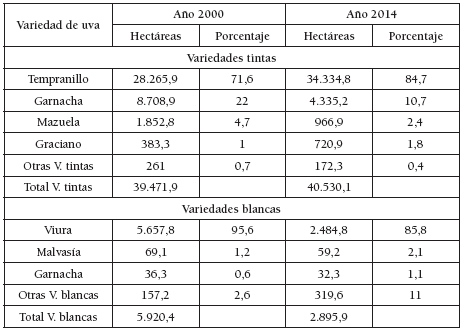 La reconversión o la reestructuración del viñedo también pueden ocasionar cambio de variedades de uva. En La Rioja, tales cambios han sido poco significativos hasta ahora (Tabla 5), si bien se prevé el incremento de las variedades blancas en los próximos años. Muy pocas variedades dominan el paisaje del viñedo, destacando el Tempranillo, seguido a bastante distancia por la Garnacha y la Viura. Entre el año 2000 y 2014 se observa una mayor simplificación varietal, incrementándose la presencia de las uvas tintas, especialmente del Tempranillo, que resta superficie al resto de variedades. De forma anecdótica hay que señalar la plantación en los últimos años de variedades blancas como Tempanillo (83,9 ha en 2014), Verdejo (73,2 ha en 2014), Turruntés (1,9 ha en 2014), Chardonnay (36,7 ha en 2014) y Sauvignon blanc (63,9 ha en 2014). La homogeneización varietal implica una pérdida de estética en el paisaje, especialmente en otoño, por disminución del cromatismo, una cuestión muy valorada por los visitantes y turistas.