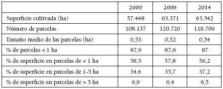 Entre 2001 y 2014 se plantaron 14.587 ha de viñedo en La Rioja, lo que supone el 33,6% de la extensión total, mientras que el viñedo de más de 30 años ocupaba sólo 10.493,4 ha, el 24,2% (Consejo Regulador DOCaRioja, 2000 y 2014), poniendo de relieve que es un viñedo joven. Lo habitual es que los nuevos viñedos ocupen parcelas de mayor tamaño que los arrancados, con el fin de optimizar el laboreo y favorecer la mecanización de su cultivo. Por otro lado, hay que tener en cuenta que el número de viticultores ha disminuido (19.437 en 2001 y 16.413 en 2014 en la DOCaRioja), lo que ha ayudado a la concentración de la propiedad, especialmente en las grandes bodegas que se han hecho con buena parte de los derechos de plantación. Sin embargo, la desfragmentación de las manchas de viñedo -ya puesta de manifiesto por Galilea, Arnáez, Lasanta, y Ortigosa (2015) en La Rioja Alta para el periodo 1956-2000- no se refleja en el parcelario del Catastro de Rústica. La Tabla 6 muestra tan sólo una ligera tendencia del viñedo a ocupar parcelas de mayor tamaño. No obstante, esta estabilidad es más aparente que real, ya que parcelas vecinas pueden tener el mismo uso configurando una sola mancha paisajística (Foto 5), mientras que la propiedad suele estar más repartida. Por otro lado, hay que tener en cuenta que pocas veces se fusionan en el catastro parcelas, aunque tengan el mismo propietario, con el fin de conservar algunos derechos, como la posibilidad de transferir o vender cada parcela por separado.