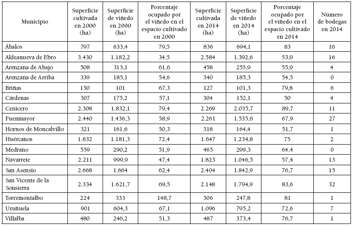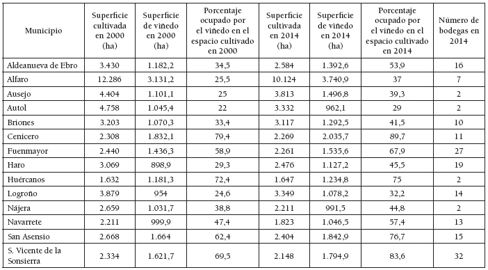 Una aproximación a la concentración del viñedo a escala municipal puede obtenerse a partir de su distribución espacial. De los 174 municipios de La Rioja, 114 cuentan con viñedos, no cultivándose la viña en el sector meridional, coincidiendo con las estribaciones del Sistema Ibérico, y en algunos municipios de la comarca de Santo Domingo de la Calzada. En el resto de La Rioja se cultiva el viñedo, aunque con distinta presencia. La tabla 7 pone de manifiesto que en 17 municipios el viñedo ocupa más del 50% del espacio cultivado en 2014, constituyendo en algunos de ellos casi un monocultivo: Ábalos (83%), Briñas (79,8%), Cenicero (89,7%), San Asensio (76,7%), San Vicente de la Sonsierra (83,6%) o Torremontalbo (81%). Por otro lado, se observa que la concentración en la mayoría de los municipios es mayor en 2014 que en 2000, sumando en la primera fecha 14.151,8 ha (el 34,1% del viñedo cultivado en La Rioja) y en la segunda 12.960,6 ha (el 32,6%). La tabla 8 muestra que 14 municipios cultivan más de 900 ha de viñedo en 2014, sumando en conjunto 21.572,2 ha (el 52% del viñedo del La Rioja), mientras que en 2000 reunían 19.150,1 ha (el 48,1%). Lógicamente, los municipios con más viñedos son los que cuentan con mayor número de bodegas.