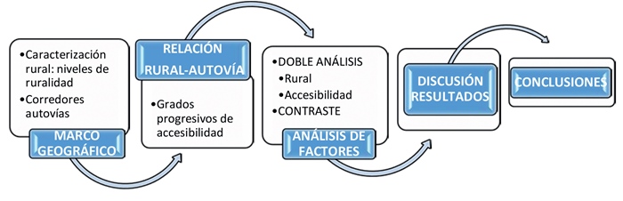 El proceso metodológico (Gráfico 1), que parte del establecimiento de un marco geográfico adecuado, se basa, en primer lugar, en la caracterización de su ruralidad. La propia relatividad del término obliga a diferenciar, dentro de un territorio extenso claramente rural, entre distintos niveles de ruralidad; en este caso se han diferenciado hasta cuatro, de más rural a menos rural. A la vez que el análisis de ruralidad, se procede al análisis de la red de autovías con el estudio de los corredores por donde discurren.
