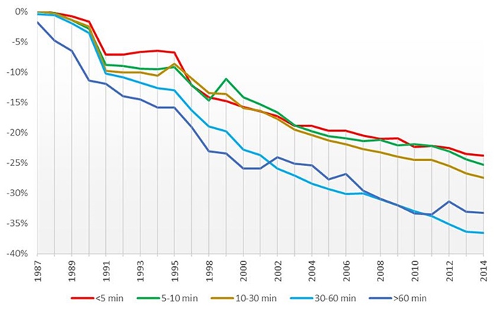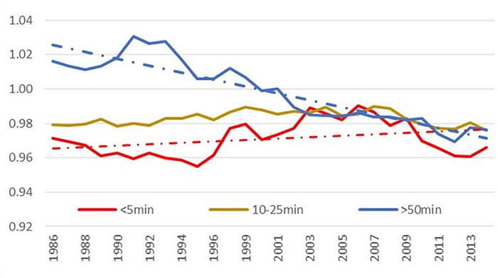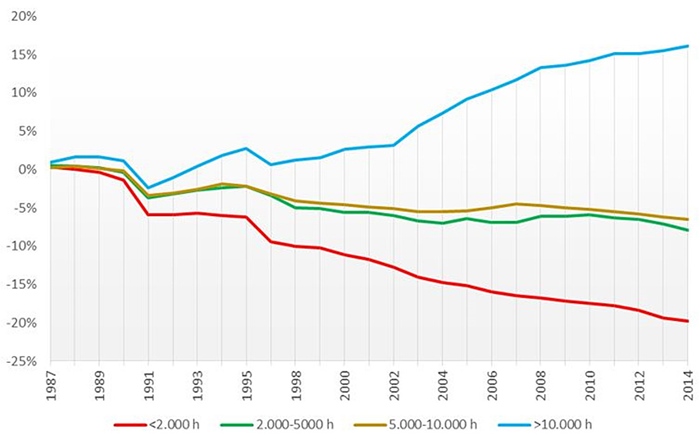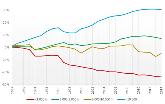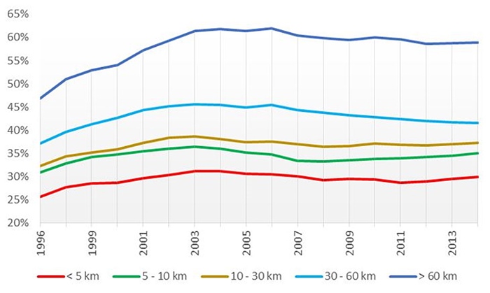 Para cada uno de los parámetros seleccionados se han realizado tablas de evolución con secuencia anual de las series disponibles y, a partir de ellas, se han elaborado gráficos según los escalones de comparación establecidos. La extensión de todas las tablas y gráficos trascienden al ámbito del presente artículo, por lo que a continuación se exponen algunos de los gráficos de evolución más representativos de algunos parámetros estudiados, que permiten analizar las diferencias de comportamiento para los distintos niveles de ruralidad y grados de accesibilidad respecto a la red de autovías.