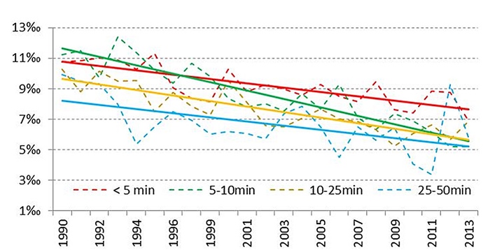 Para la interpretación de la tasa de natalidad es preciso utilizar de nuevo líneas de tendencia debido a la variabilidad anual del parámetro (Gráfico 9). La tendencia a la baja es general. Aun así, se observa un orden decreciente de magnitud de valores según aumenta la distancia a la autovía, de nuevo las poblaciones cercanas (en este caso de tamaño de 2000 a 5000 hab.) tienen mayores tasas de crecimiento.