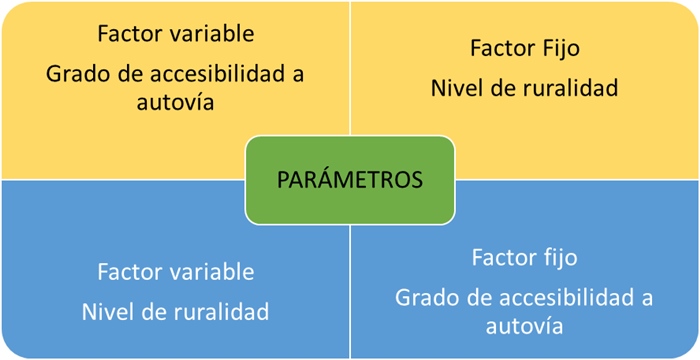 La detección de la posible relación del parámetro estudiado con la presencia de la autovía o su ruralidad se consigue con un doble análisis que considera, en primer lugar, como factor fijo el nivel de ruralidad y variable el grado de accesibilidad y, en segundo, de forma inversa, factor fijo la accesibilidad y variable la ruralidad (Gráfico 2). Este sistema permite objetivar el comportamiento de cada factor de forma independiente.