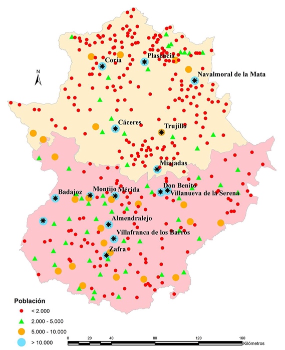 En cualquiera de los casos, densidad o población por municipio, Extremadura es claramente rural aplicando distintas clasificaciones de numerosos autores u organismos (Camarero Rioja, 1991; García Sanz, 1996; Serratosa, 2002; European Commisssion, Julio 1997; INE, 1981; LEY 45, 2007). A partir de ellas los municipios menores de 2.000 hab. se pueden considerar estrictamente rurales, entre 2.000 y 5.000 hab. rural de medio tamaño y a partir de 10.000 hab. pueden categorizarse como urbanos.