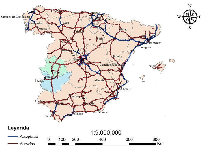 La red de autovías de Extremadura es resultado de un largo proceso histórico, iniciado con las vías romanas, denostado en la edad media, recuperado en el siglo de la Ilustración, modernizado en el siglo XX y definitivamente consolidado en el inicio del siglo XXI, desembocando en la actualidad en unas autovías incardinadas en la red estatal y complementada con dos autovías autonómicas, todas concebidas y desarrolladas por planes sectoriales de transporte (Figura 2). Diversos estudios demuestran la coincidencia de gran parte de los corredores actuales con las calzadas romanas y los caminos del XVI-XVIII. (Uriol Salcedo, 1985; Uriol Salcedo, 1977), extremo que se constata con la comparación de mapas en los que se ubican los caminos históricos y las autovías actuales.