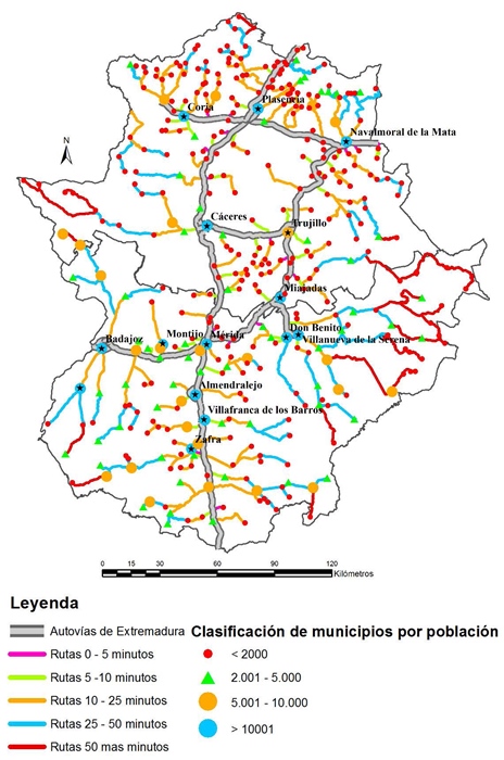 Volcando los municipios según su nivel de ruralidad sobre el mapa de los principales corredores se puede estudiar su relación (Figura 3). Todas las poblaciones de más de 10.000 hab. están ubicadas al lado de una autovía. Sólo está aislada Olivenza en el oeste de Badajoz, Zafra se ubica a menos de 10 km conectada por una carretera nacional y Montijo conecta con la A5 por una carretera regional de longitud 5 km. Se puede asegurar que se cumple la premisa de que los municipios menos rurales extremeños están conectados por autovía (a excepción de Olivenza que conecta con la A5 mediante una carretera autonómica de 25km). Por el contrario, sólo 6 de las 25 poblaciones entre 5.000 y 10.000 hab. se ubican junto la autovía. La dispersión por el total del territorio, alejadas de la autovía, es la nota dominante para municipios menores de 5.000 hab.