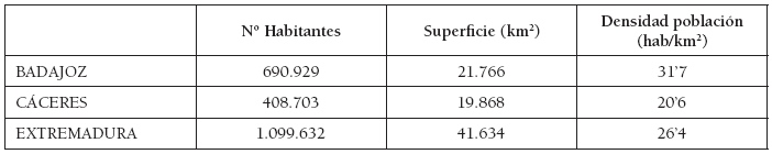 Extremadura cumple los condicionantes rurales característicos de población escasa poco participativa respecto el conjunto nacional y débil ocupación del territorio (Pérez Díaz, 2014). En términos comparativos con la población total española (según datos del INE de 01/01/2014) con 46.512.199 habitantes y una densidad media de 91’9hab/km2, la población extremeña alcanza el 2’36 % del total nacional1 ocupando el 8’2 % de su extensión territorial. La densidad de población en Extremadura es tres veces y media menor. Distinguiendo entre provincias, para la misma fecha de referencia, se obtienen los siguientes datos (Tabla 1):