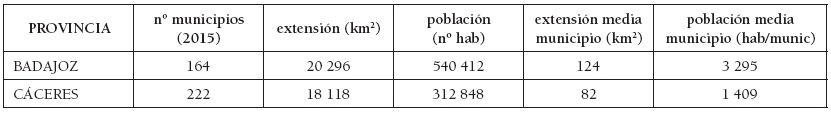 En la actualidad la comunidad extremeña cuenta con un total de 388 municipios (165 en la provincia de Badajoz y 223 en Cáceres). Según el Registro de Entidades Locales del Ministerio de Hacienda y Administraciones Públicas el número total de municipios españoles es de 8.122, con una población media por municipio de 5.727 hab. El 2’36 % de población se distribuyes en el 4’8 % de municipios. La tipología de los municipios de cada una de las provincias según su extensión y población se indica para cada provincia en la Tabla 2. La comparación de los datos de Extremadura con los de España destacan por tener una densidad media de población 3’5 veces menor, proporción que aumenta a 4’5 en la provincia de Cáceres y disminuye a 2’9 en la de Badajoz.