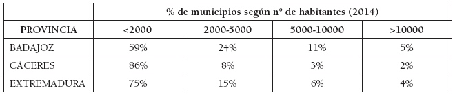 Los porcentajes de la Tabla 3 denotan sin lugar a dudas la ruralidad de Extremadura desde la perspectiva poblacional, a la que suman aspectos también endémicamente rurales como pérdida de habitantes en poblaciones de menor tamaño, envejecimiento, alto índice de masculinidad o actividad agraria preponderante (Pérez Díaz, 2006), (Nieto Masot & Gurría Gascón, 2008).