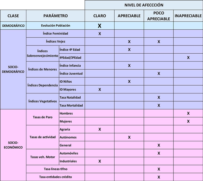 No se considera en el presente estudio el análisis de todos los posibles parámetros, sería una tarea inabordable además de inconexa, por lo que se enfoca hacia aquéllos claramente representativos cuya disponibilidad de datos permitan obtener resultados suficientes para comprobar la consecución de los objetivos fijados y, en su caso, proponer otras líneas de investigación complementarias. Por todo ello se aborda el estudio de parámetros relacionados con la evolución poblacional (demográficos), con el comportamiento de la población (socio-demográficos) y con su actividad económica (socio-económicos).