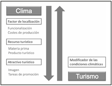 El clima y, por extensión, el tiempo meteorológico son elementos básicos a tener en cuenta en las regiones-destino de los flujos turísticos por la influencia que ejercen en la competitividad y en la sostenibilidad, tanto a corto como a largo plazo. Cabe pensar que el tiempo meteorológico condiciona, según la mayor o menor sensibilidad de la modalidad turística practicada hacia los elementos atmosféricos, la programación y el normal desarrollo de las actividades turísticas (Gómez Martín y Martínez Ibarra, 2012; McKercher, Shoval, Park y Kahani, 2014; Moreno, Amelung y Santamarta 2008; Shih, Nicholls y Holecek, 2009). Del mismo modo, el tiempo meteorológico influye en el buen funcionamiento de los transportes y comunicaciones, facilitando o condicionando el desplazamiento turístico. En los destinos turísticos, la variabilidad climática intra e interanual ejerce un notable influjo en la estacionalidad turística, el abastecimiento de agua, la producción artificial de nieve, el gasto energético o las necesidades de riego o ajardinamiento, por citar tan solo algunos ejemplos (Gómez Martín, 2003; Martínez Ibarra, 2015; Ridderstaat, Oduber, Croes, Nijkamp y Martens, 2014). Los fenómenos meteorológicos extremos comprometen, en diferente medida, la seguridad en los destinos por lo que deben ser considerados en los sistemas de alerta temprana, la comunicación de riesgos a los agentes turísticos y a los turistas y, por supuesto, en la ordenación de los destinos (Bigano, Goria, Hamilton y Tol, 2005).