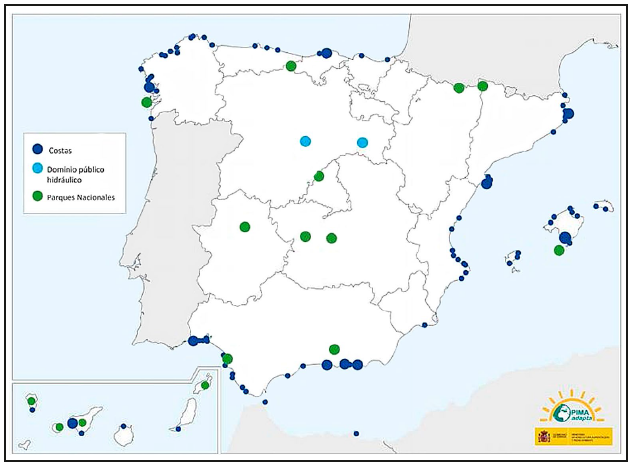 También la Ley 2/2013, de 29 de mayo, de Protección y uso sostenible del litoral y de modificación de la Ley 22/1988, de 28 de julio, de Costas, incluye la consideración del cambio climático por ser las zonas de litoral las que presentan un mayor riesgo de sufrir los impactos del fenómeno. La reforma de la Ley contiene regulaciones específicas y limitación de ocupaciones, así como la elaboración de una Estrategia para la Adaptación de la Costa a estos efectos (actualmente en fase de tramitación de evaluación ambiental estratégica) que busca conseguir un diagnóstico riguroso de los riesgos asociados al cambio climático que afectan a la costa española y de las posibles medidas a implementar para reducir sus efectos. Dentro del Plan de Impulso al Medio Ambiente para la Adaptación al Cambio Climático (PIMA-Adapta) se han llevado a cabo más de 40 proyectos en materia de gestión del litoral que pretenden reducir la exposición al fenómeno a través de la regeneración de playas, restauración de dunas, estabilización de las partes bajas de los estuarios o la construcción de obras de protección que reduzcan la erosión (Figura 2).