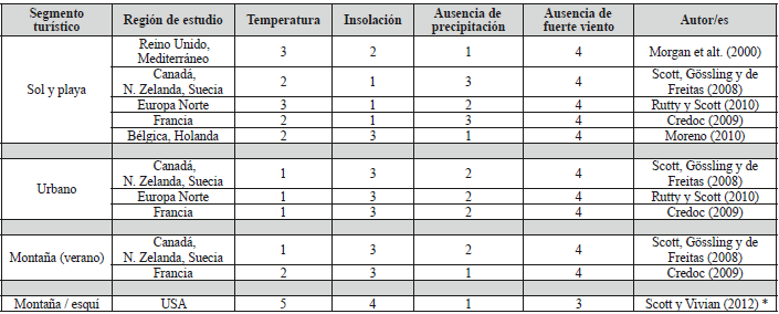 Scott, Hall y Gössling, 2012.Los criterios de segmentación del mercado turístico que pueden resultar de interés en el ámbito de la Climatología turística son, en primer lugar, los criterios de segmentación específicos relacionados con la modalidad turística practicada en destino (turismo de sol y playa, turismo de senderismo, turismo cultural, turismo de deportes de invierno, etc.) y, en segundo lugar, los criterios de segmentación generales relacionados con las características geográficas y sociodemográficas de los consumidores-turistas (procedencia, destino, edad, sexo, ciclo de vida, etc.). Así, por ejemplo, en toda evaluación de potencialidad climático-turística se hace necesario determinar, al menos, la modalidad turística objeto de atención y la procedencia geográfica y/o destino del segmento considerado.