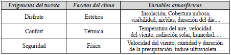 Exigencias climáticas del turista. El turista desea desarrollar sus actividades en unas condiciones atmosféricas que permitan garantizar sus exigencias de disfrute4, confort5 y seguridad6. En este sentido, los análisis de potencialidad deben determinar qué exigencia o exigencias evalúan y, en consecuencia, tratar de elegir las variables atmosféricas que permitan valorarlas, ya sea total o parcialmente. Cada una de estas tres exigencias climático-turísticas se relaciona con una de las facetas del clima conceptualizadas por Perry (1993) y De Freitas (2003) en materia de turismo: la faceta estética7, la faceta térmica8 y la faceta física9, siendo las variables atmosféricas relativas a cada faceta las que deben ser consideradas en los análisis de potencialidad (Tabla 2).