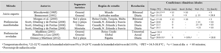 Las preferencias atmosféricas del turista. Determinado el segmento de demanda y establecida la exigencia o exigencias a evaluar y, por tanto, seleccionadas las variables atmosféricas a tomar como punto de partida para realizar la evaluación, se hace necesario establecer en cada una de ellas umbrales favorables en diferentes grados y desfavorables para la práctica turística. El establecimiento de estos umbrales se puede realizar en base a juicio experto, preferencias manifestadas o preferencias reveladas, si bien es cierto que la primera de las opciones debe ser descartada por su desmesurado sesgo subjetivo (Tabla 1 y 3). De este modo: